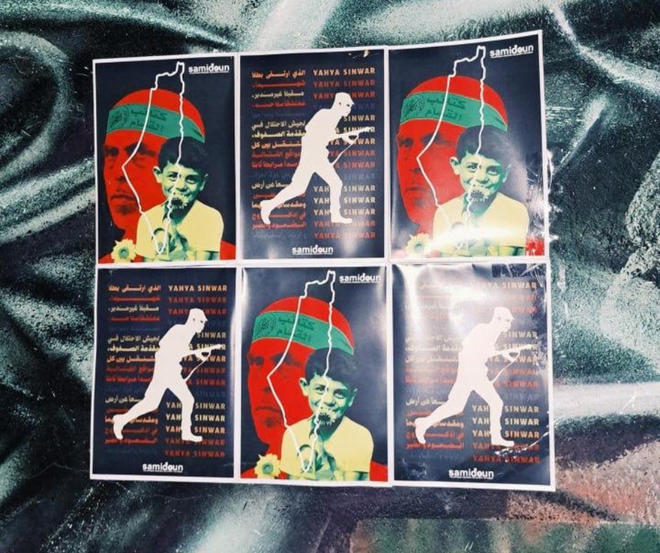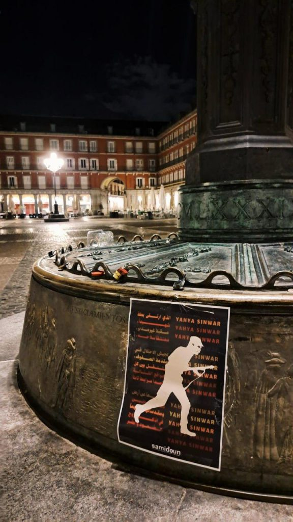 Carteles aparecidos en el centro de Madrid en los que aparece el rostro y el nombre del dirigente de Hamas Yahya Sinwar, con mapas en los que desaparece Israel y firmado por la organización Samidoun, prohibida en algunos países de la Unión Europea.