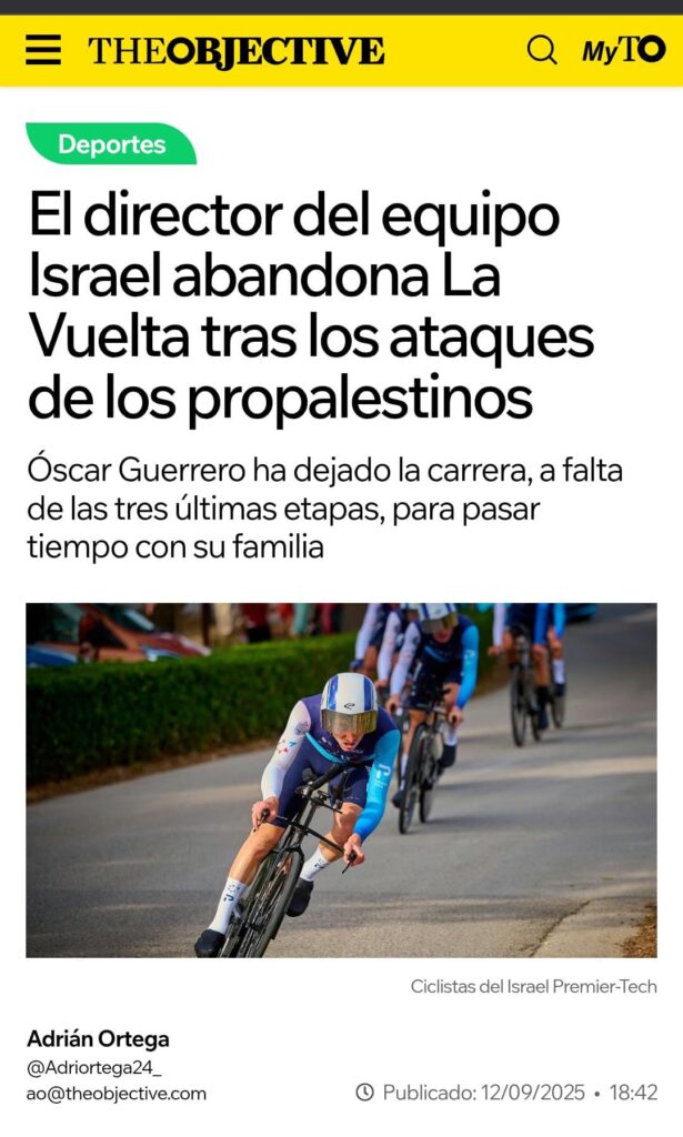 Vuelta a casa a tres etapas de finalizar. Óscar Guerrero, director del equipo Israel-Premier Tech en La Vuelta, decidió abandonar la competición para reunirse con su familia en Navarra. Esta salida se produce en medio de la controversia y el ambiente tenso que ha rodeado al equipo. El conjunto, que cuenta con Riccitello en la sexta posición de la general, continuará disputando las tres finales hasta llegar a Madrid bajo la dirección del sudafricano Daryl Impey, según ha informado Cope.