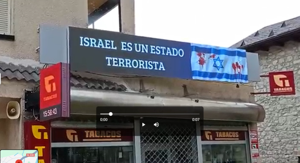 Un estanco situado en la carretera N-330 ha instalado un cartel digital en su local con mensajes como “Israel es un Estado terrorista” y la bandera de Israel manchada de sangre.