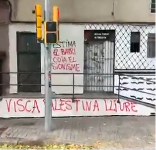 El día 22 de octubre, después de haber sido limpiada de una primera pintada, la fachada del edificio donde vive una persona israelí en Barcelona, volvió a aparecer vandalizada con la leyenda: «estima el barrio, odia el sionismo» y «viva Palestina libre», con símbolos de la kufiya, el típico pañuelo palestino.